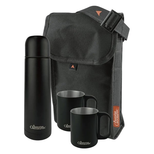 AUSTRALIAN GEOGRAPHIC STAINLESS STEEL FLASK AND MUG SET BLACK