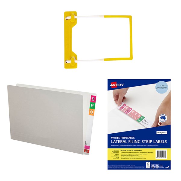 • Includes 300 Foolscap White Lateral Files (7005839), 200 Tubeclip Fasteners (7010576), 400 Avery Lateral Filing Labels (7005388)
