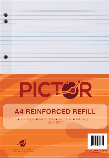 PICTOR REINFORCED A4 LOOSE LEAF REFILL 8MM RULED 50 SHEETS