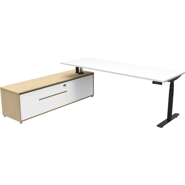- The integrated side cabinet provides ample storage with drawers and cupboards, enhancing workspace organisation and keeping your essentials within easy reach