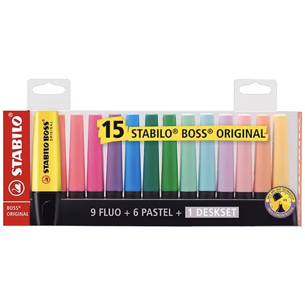 The Stabilo Boss Original Highlighter In An Attractive Desk Set Made From Recycled Plastic With 9 Fluorescent And 6 Pastel Colours
