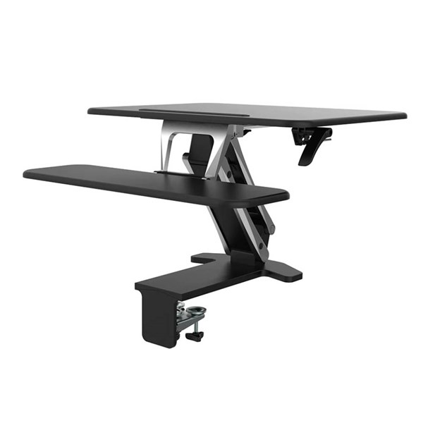 - The clamp on unit simply attaches to the front edge of any surface and provides a one handle easy adjustable sit stand work surface