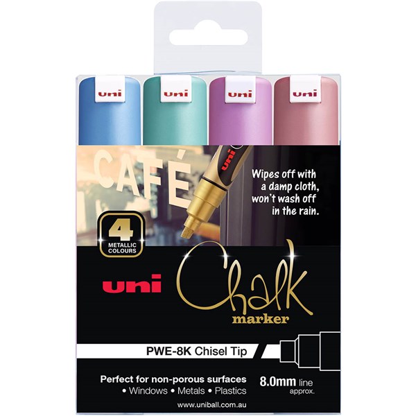UNI-BALL CHALK MARKER CHISEL TIP 8MM ASSORTED METALLIC PACK 4