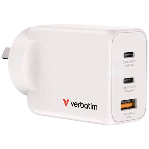 Verbatim's 65W GaN Wall Charger combines two USB-C PD and one USB-A QC 3.0 port in a sleek, palm sized design