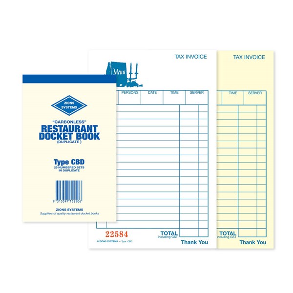 - Zions offers a wide range of single, duplicate, triplicate and quadruplicate restaurant docket books, suitable for all styles of bistros, cafes, restaurants and take-away outlets