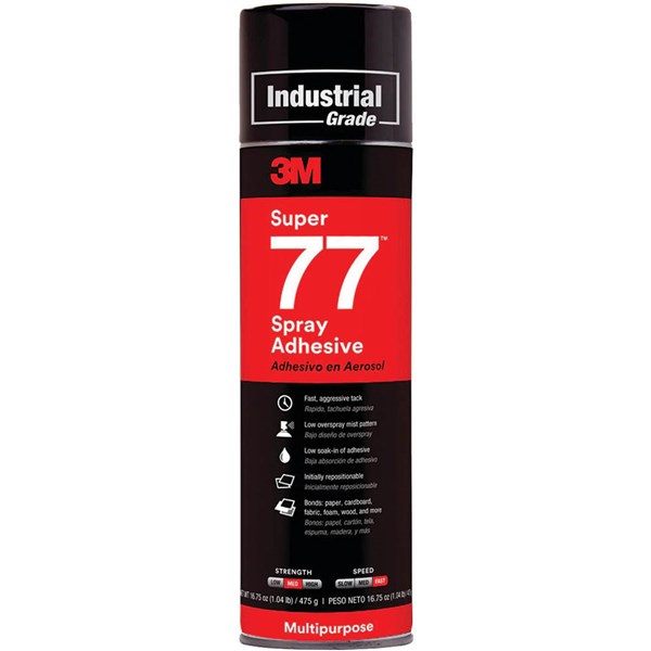 3M Super 77 Multipurpose Spray Adhesive is an extremely versatile, fast-drying, and transparent spray adhesive that bonds a wide range of lightweight materials
