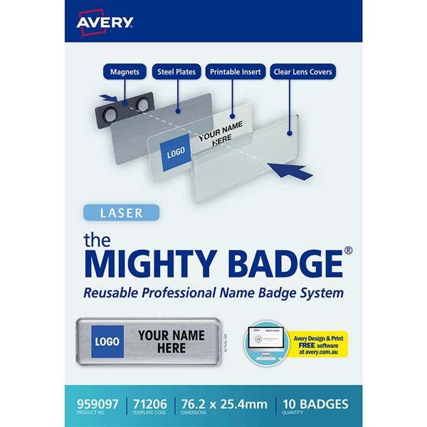 - Simply customise your insert sheets, feed them through your laser printer and remove from the easy-to-peel backing sheet before slipping them into your Mighty Badge