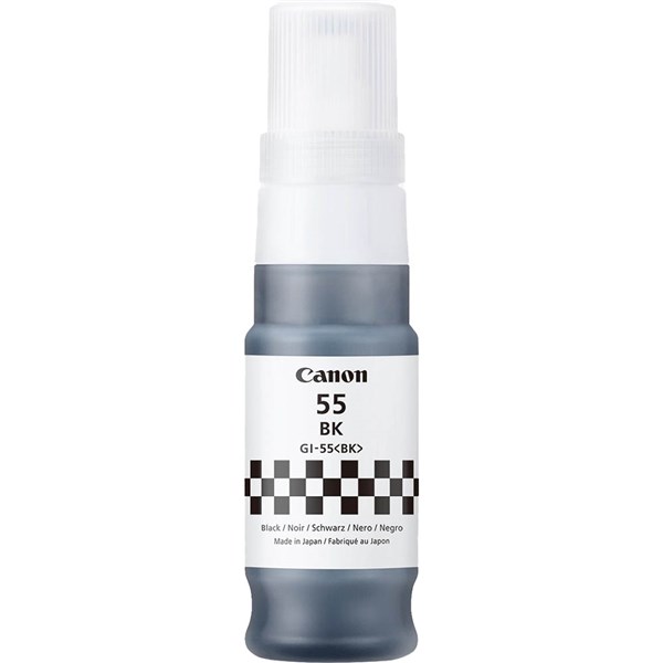 The Canon GI-55BK black ink bottle delivers sharp pigment black ink to enable the output of business documents and photos at home and at work