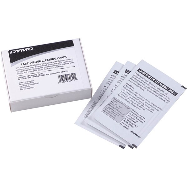 DYMO LabelWriter Cleaning Cards remove contamination from the printhead, platen, and label path inside your LabelWriter