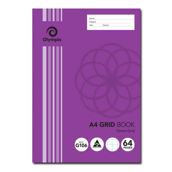 The Olympic Grid Book 10mm A4 Purple 64 Pages is an A4 exercise book suitable for graphing, drawing, and note-taking