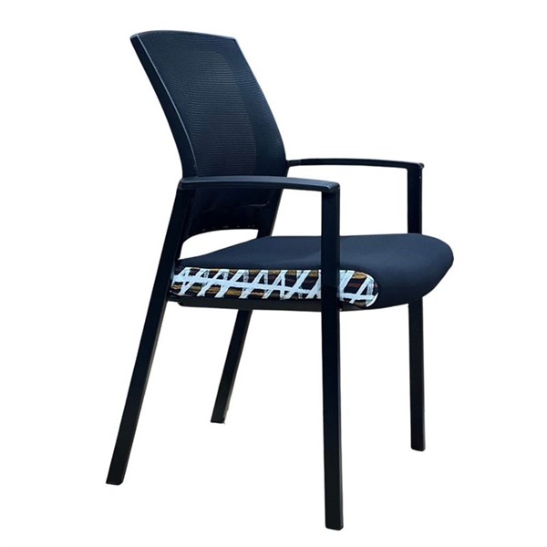 This chair is designed for aged care, education, visitor seating, break-out zones or any office areas with indigenous fabric and black commerical fabric upholstered for the seat
