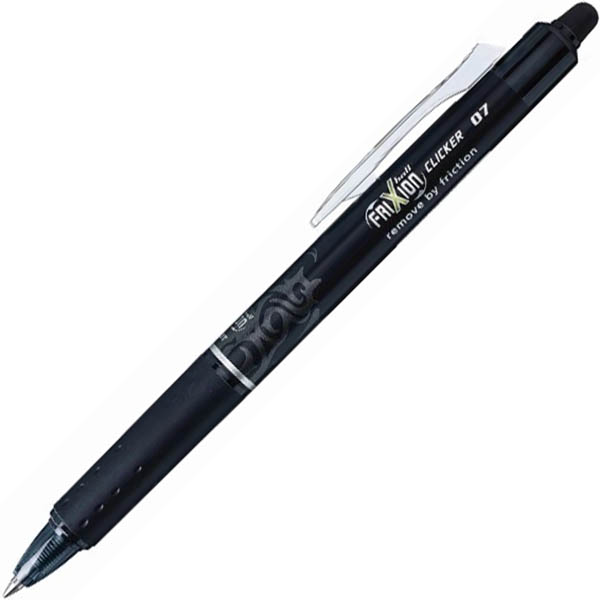 The erasable Frixion Clicker is a unique retractable gel pen that contains thermo sensitive gel ink. The heat generated by friction when rubbing the paper with the special tip turns the ink invisible