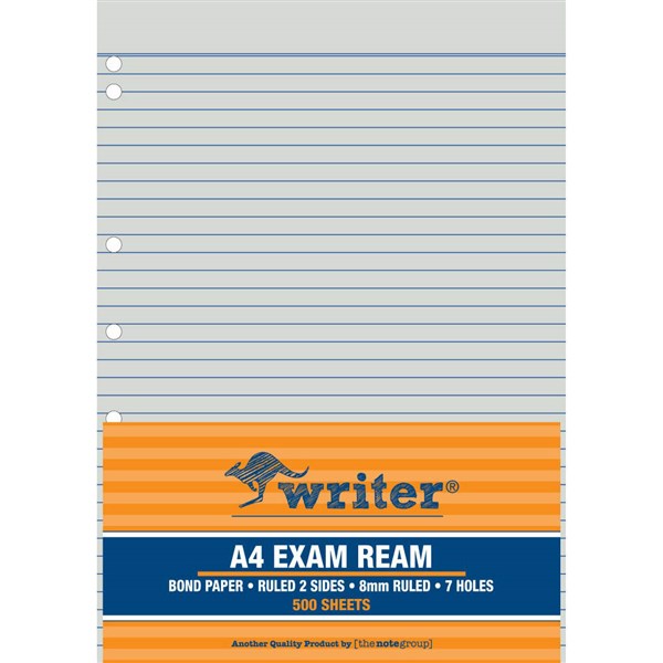 WRITER EXAM PAPER 60GSM 8MM RULED + MARGIN 7 HOLE PUNCH A4 WHITE 500 SHEETS
