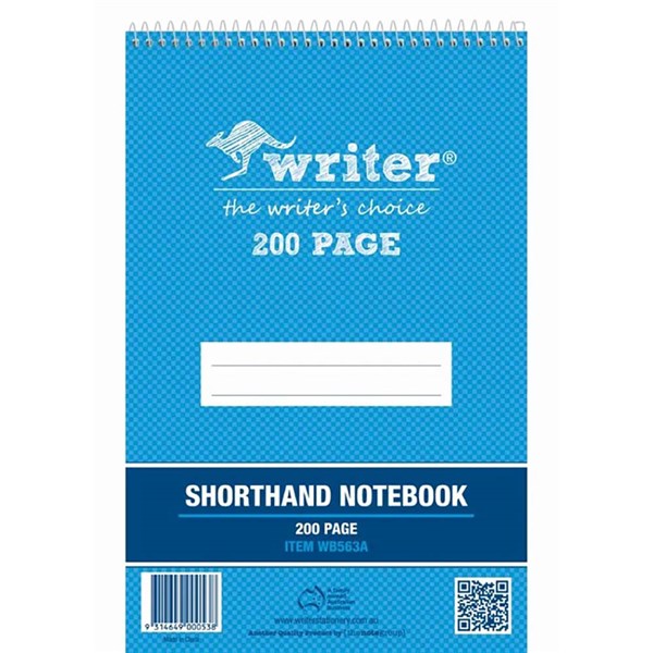 The Writer shorthand spiral note book is a quality reporter size notebook featuring a cardboard cover, 60gsm paper with blue ruled lines x 2 sides and a strong backboard